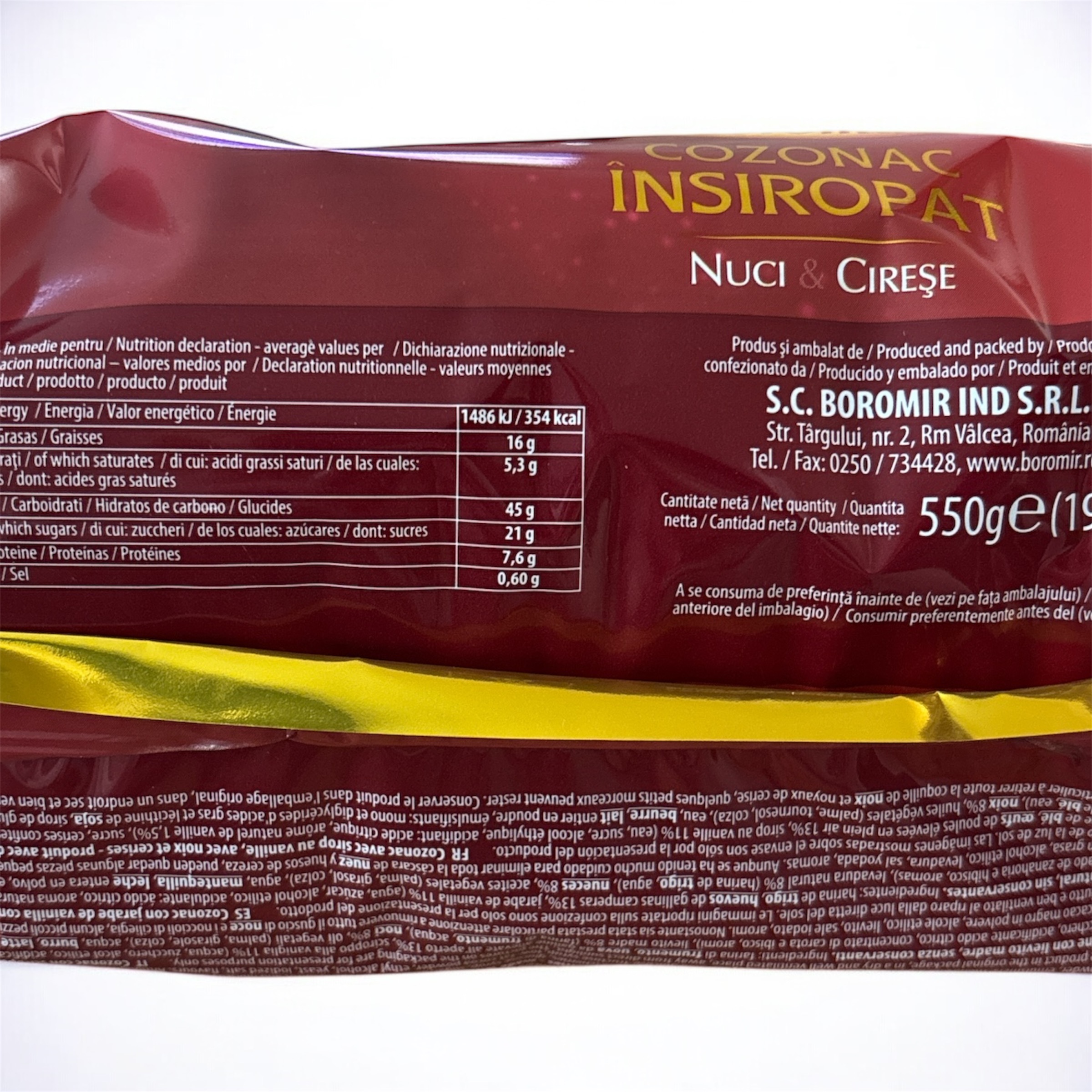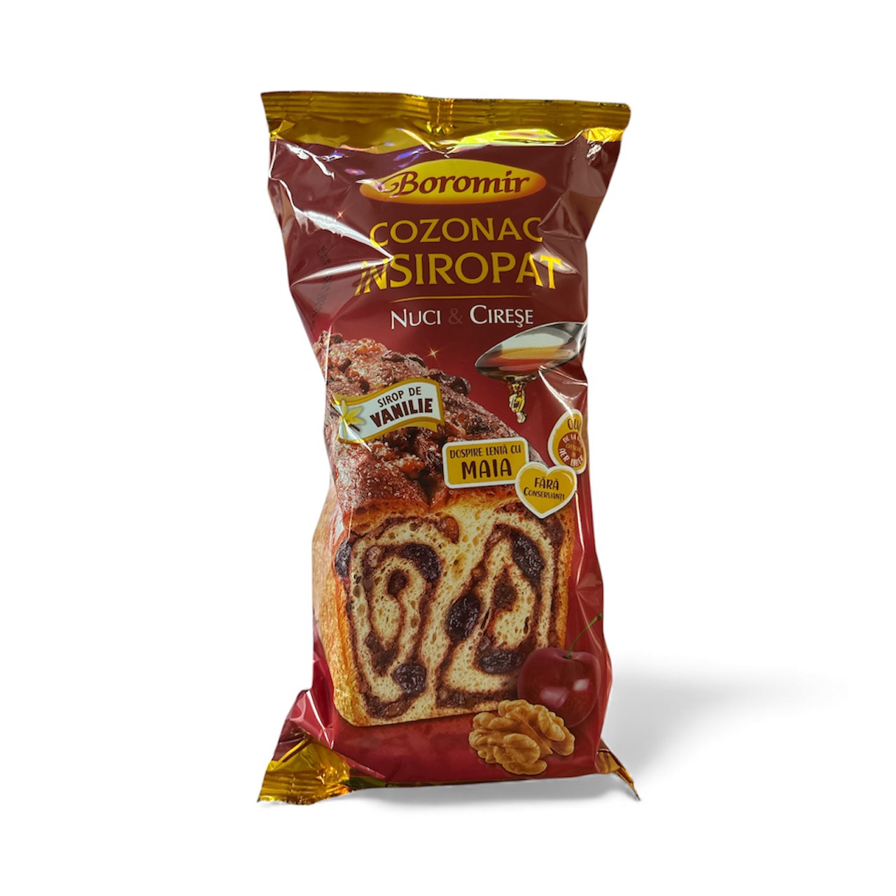 Boromir’s Cozonac with Vanilla Syrup, Walnuts, and Cherries ( Cozonac Insiropat Nuci & Cirese) is a rich and traditional Romanian sweet bread crafted with care using a classic homemade recipe. This soft, fluffy loaf is soaked in delicate vanilla syrup and filled with a delicious blend of crunchy walnuts and juicy candied cherries, creating a perfectly balanced and festive flavor.