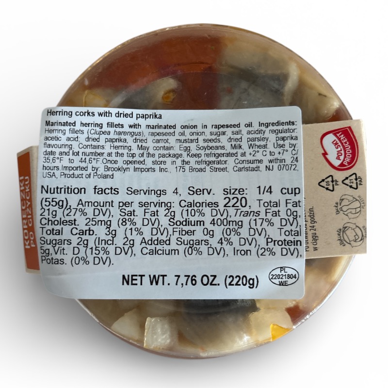 Seko Herring Corks with Dried Paprika, Koreczki Sledziowe po Gizycku are made from high-quality herring fillets, carefully cut into bite-sized pieces and marinated in a flavorful blend enhanced with dried paprika. The paprika adds a mild sweetness and subtle smokiness that perfectly complements the delicate texture of the herring.