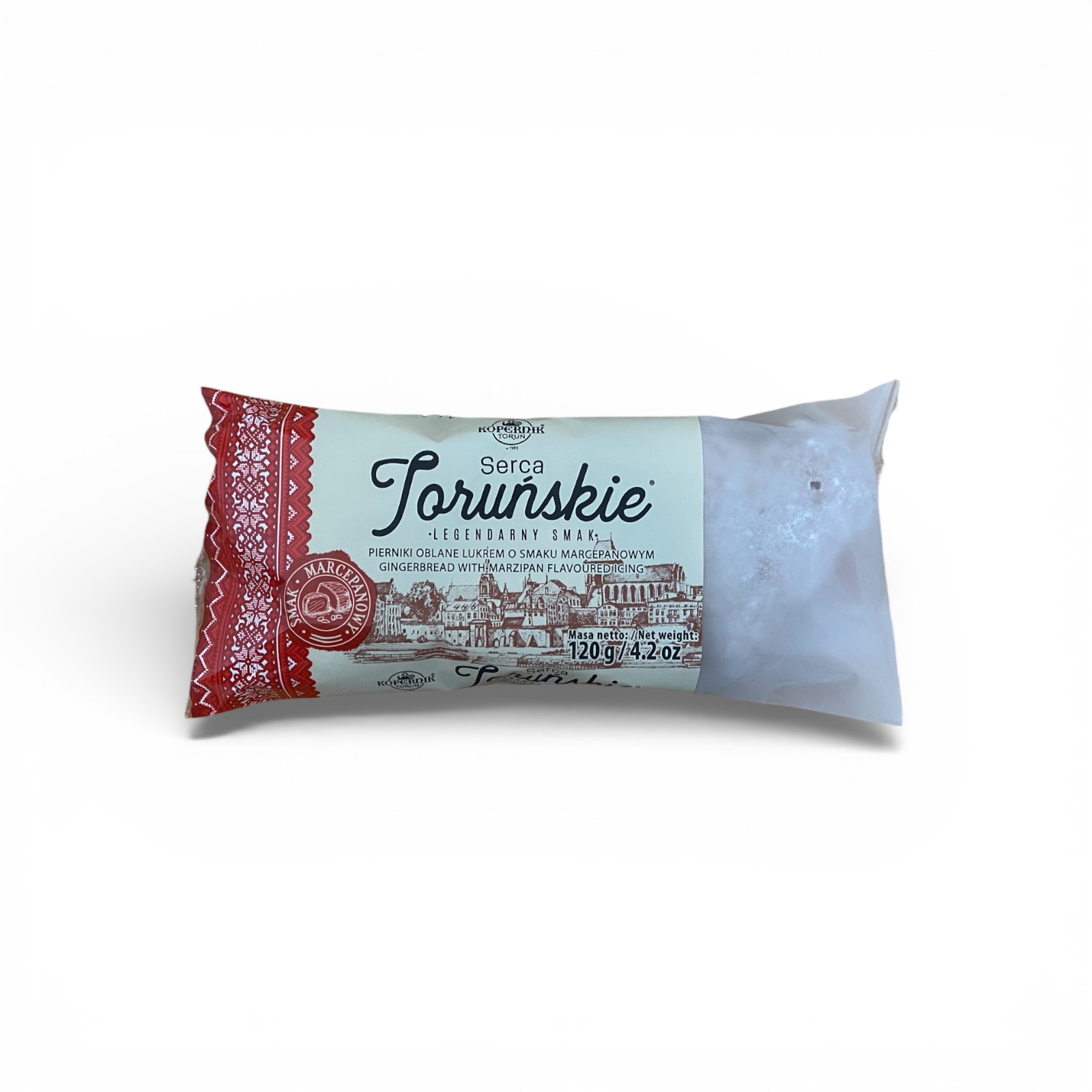 Kopernik Serca Toruńskie are classic Polish pierniki (gingerbread cookies) from Toruń, a city famous for its centuries-old gingerbread tradition. These heart-shaped gingerbreads are delicately spiced and coated with a smooth marzipan-flavored icing, creating a perfect balance of warm spices and sweet almond notes.
