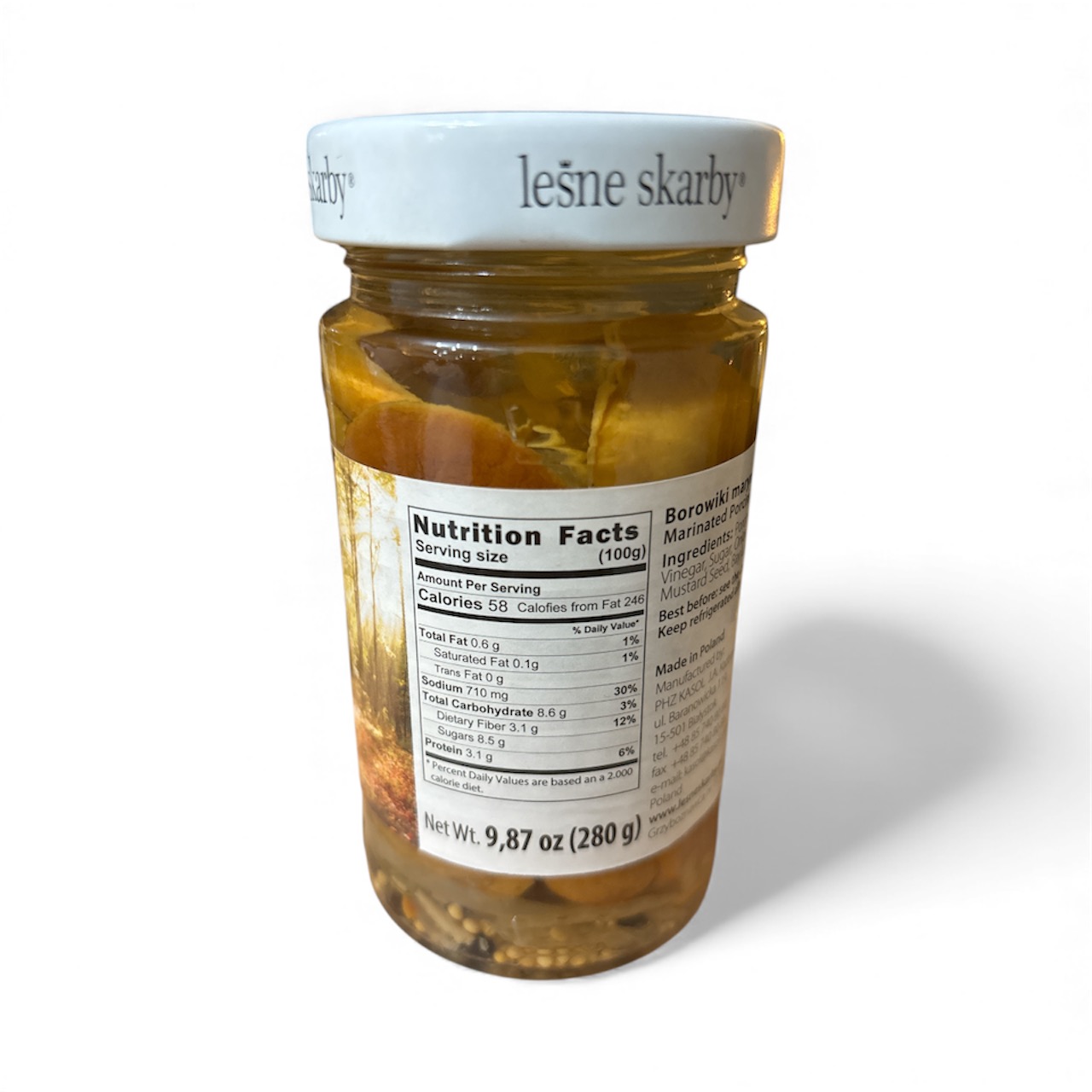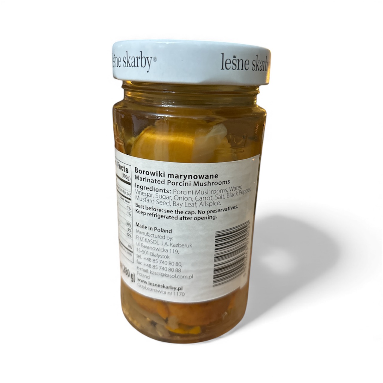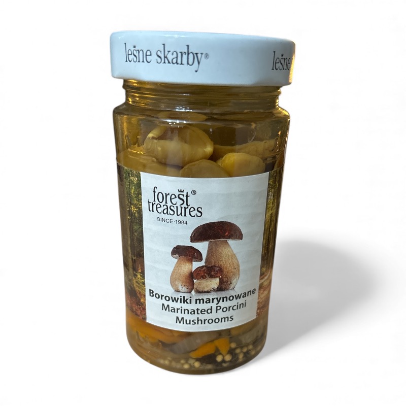 Leśne Skarby Marinated Porcini Mushrooms, Borowiki Marynowane bring the exceptional flavor of wild forest mushrooms to your kitchen. Porcini, known as the “king of mushrooms,” are prized for their deep, earthy aroma and meaty texture. These carefully selected mushrooms are preserved in a traditional marinade of vinegar, herbs, and spices to maintain their natural flavor and quality.