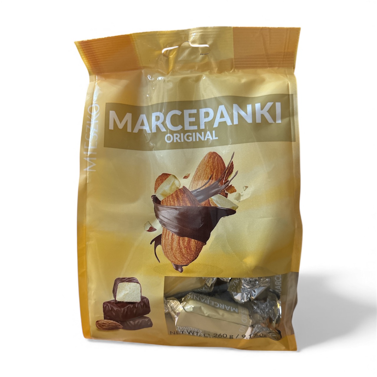 Marcepanki Marzipan in Dark Chocolate by Mieszko is a beloved Polish confection crafted for true marzipan lovers. Each piece features a smooth, aromatic almond marzipan center wrapped in a perfectly balanced layer of premium dark chocolate. The combination creates a rich, indulgent flavor that melts in your mouth.