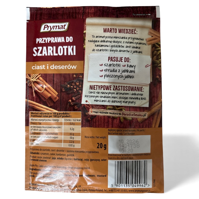 Add warmth and sweetness to your baking with Prymat Apple Pie Seasoning (Przyprawa do Szarlotki). This traditional Polish spice blend combines the rich aroma of cinnamon, cloves, nutmeg, and vanilla to bring out the natural flavor of apples in your favorite desserts.