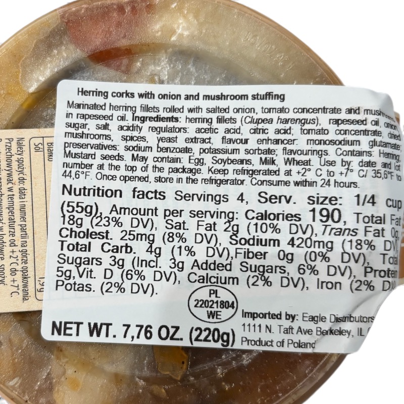 Discover the rich, authentic flavor of Seko Herring Corks with Onion and Mushroom, Koreczki Sledziowe po Mysliwsku a classic Eastern European delicacy made from delicate herring fillets rolled and filled with a flavorful vegetable mixture. The combination of sweet onions and earthy mushrooms creates a perfectly balanced filling that complements the mild, tender fish.