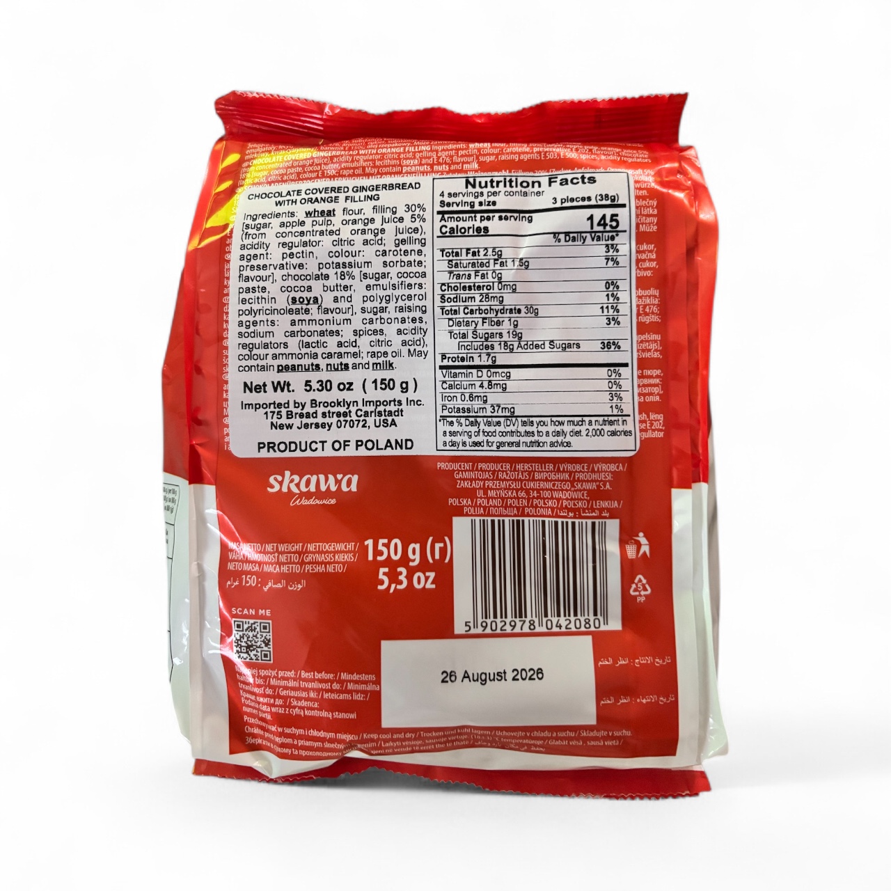 Skawa Chocolate Covered Gingerbread with Orange Filling, Pierniczki w Czekoladzie z nadzieniem Pomaranczowym 150g (5.3oz) combines the warm spice of traditional Polish pierniki with the refreshing taste of orange and a smooth layer of chocolate.